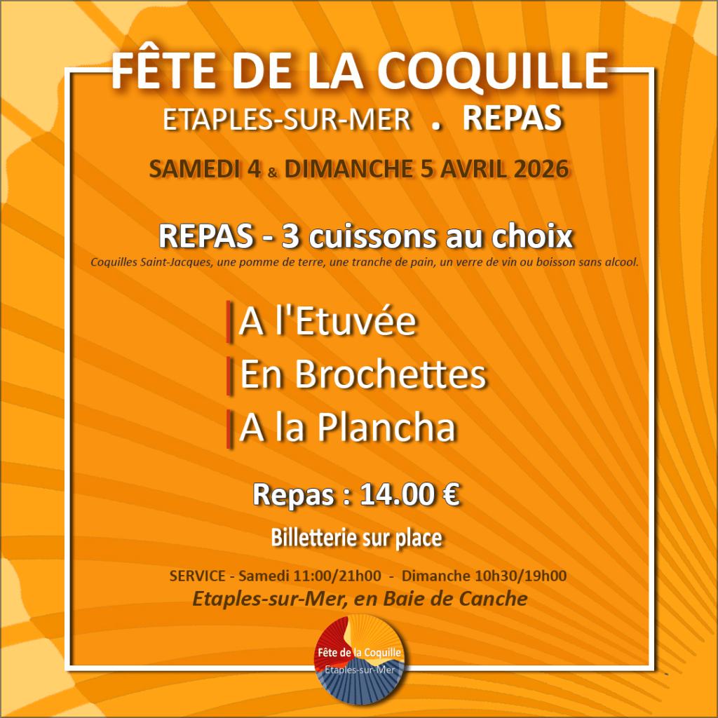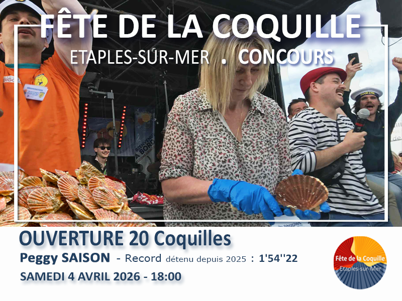 2 jours de fête avec accès gratuit pour tous, sur l’aire de Baie de Canche. La Fête de la Coquille Etaples-sur-Mer vous donne rendez-vous pour la prochaine édition Samedi 4 & 5 avril 2026. Découvrez le programme complet 2026 très prochainement.