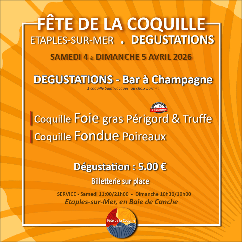 Rendez-vous les 4 & 5 avril 2026 pour la 8ème édition de la Fête de la Coquille Etaples-sur-Mer, en Baie de Canche en empruntant la promenade sur pilotis depuis le port, 650 m soit 9′ à pied.